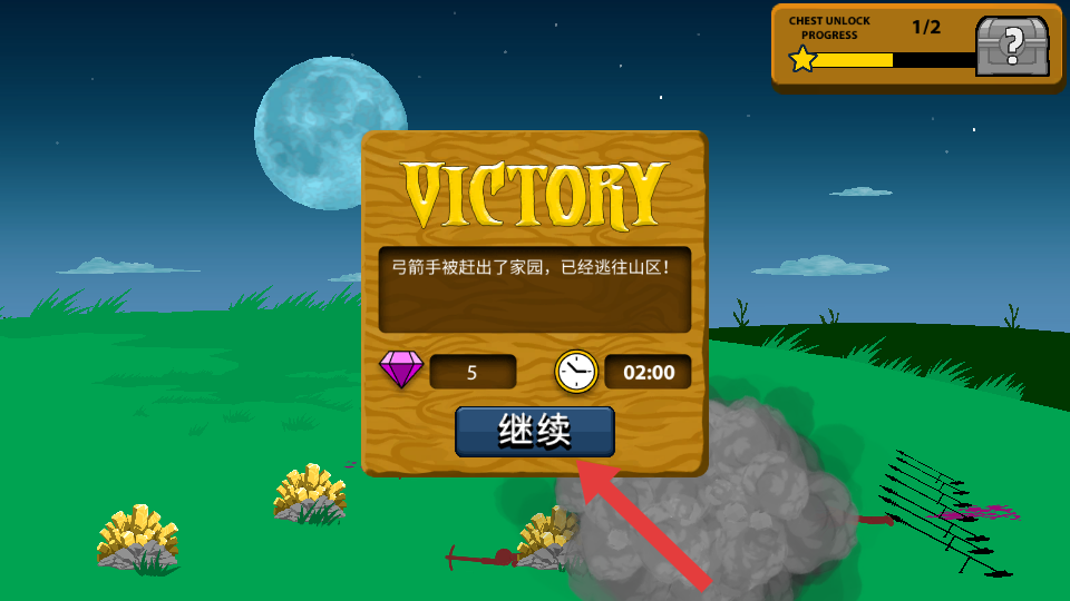 4、战斗胜利后,点击【继续】按钮,可继续挑战下一场战斗,积累更多资源和奖励。