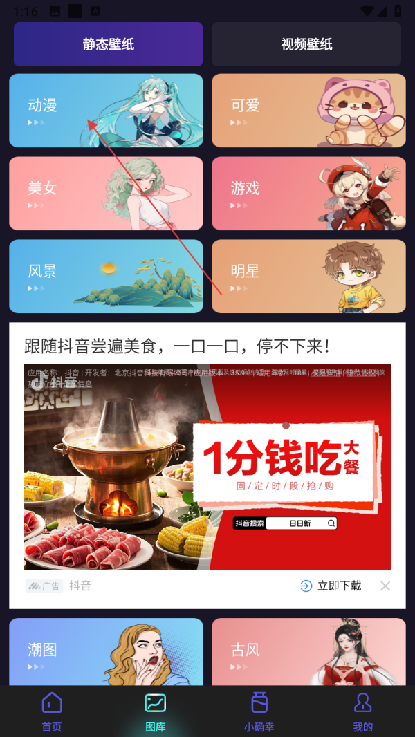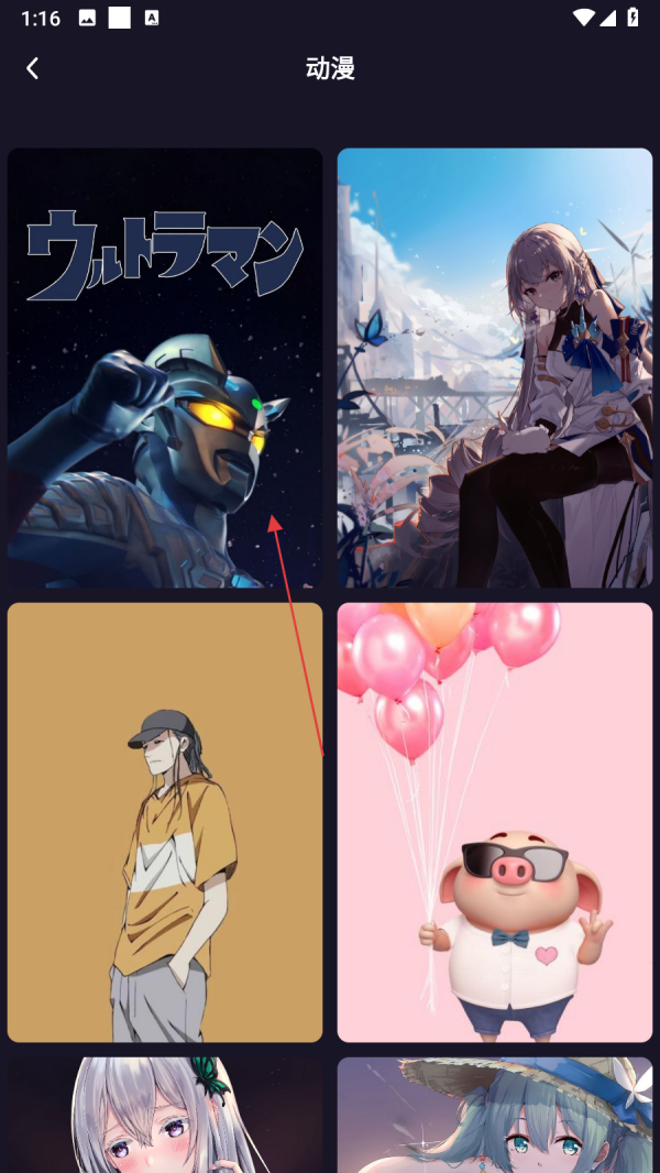 2、在图库页面,点击【动漫】分类,进入动漫壁纸列表页面。