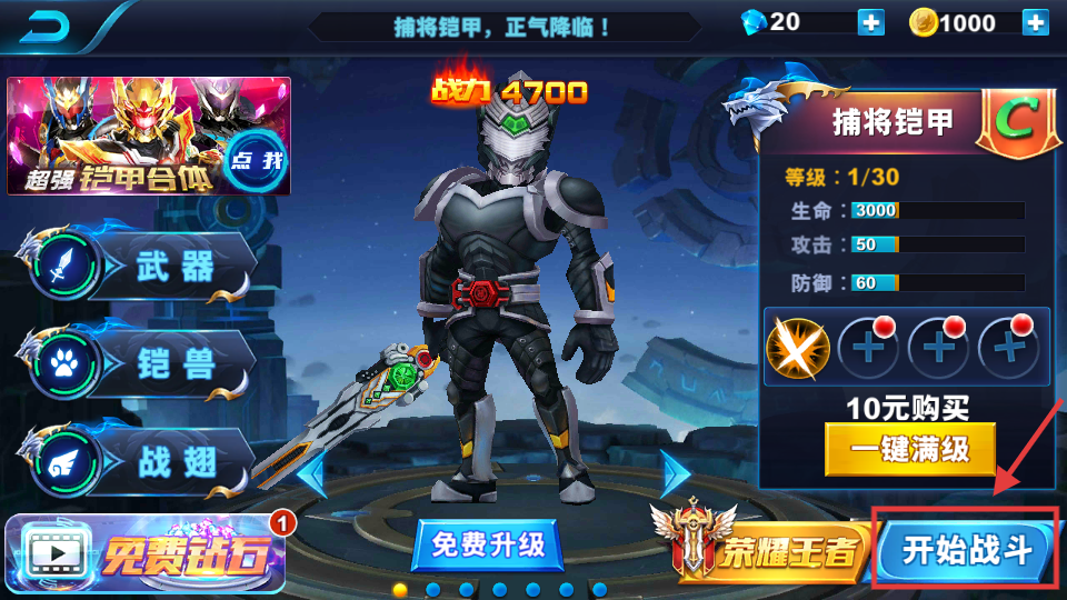 1、选择捕将铠甲,查看战力【4700】、生命【3000】等属性后,点击【开始战斗】进入战场,开启冒险。