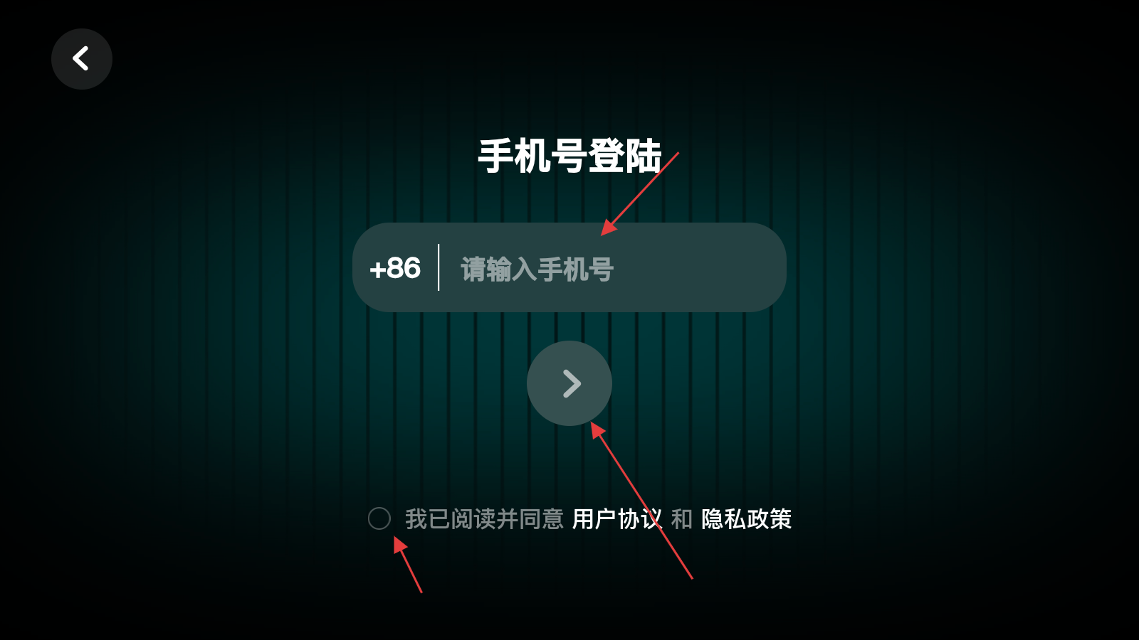 3、在手机号登陆页面,勾选【同意协议】,输入【手机号】,点击【箭头按钮】。