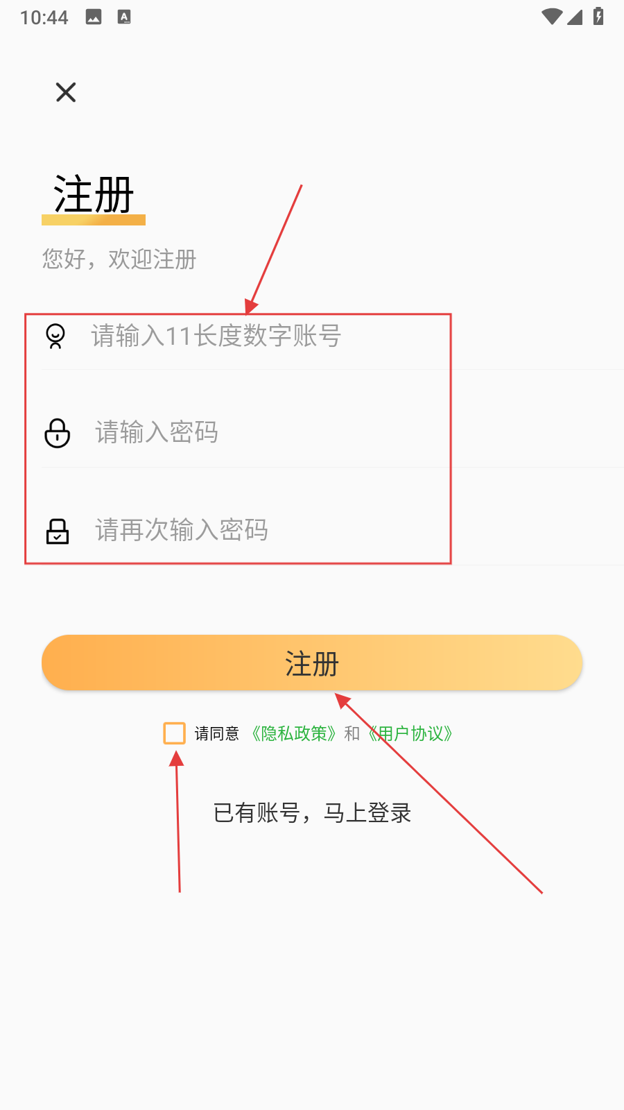 4、输入【11位数字账号、密码,勾选同意协议】,点击【注册】即可完成操作。
