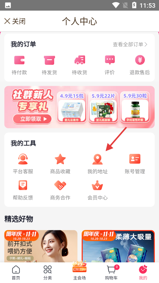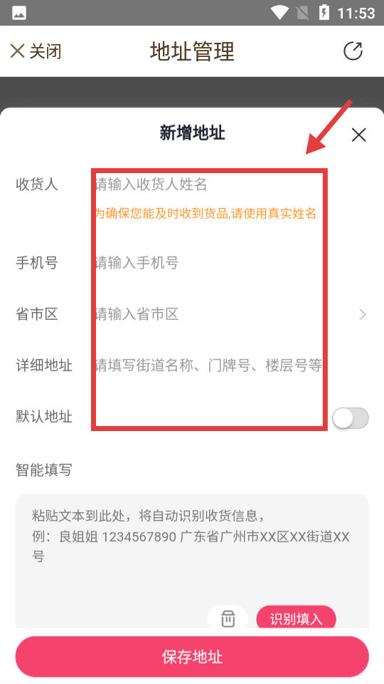 4、填写收货人姓名、手机号、省市区、详细地址等信息,填写完成后点击【保存地址】。