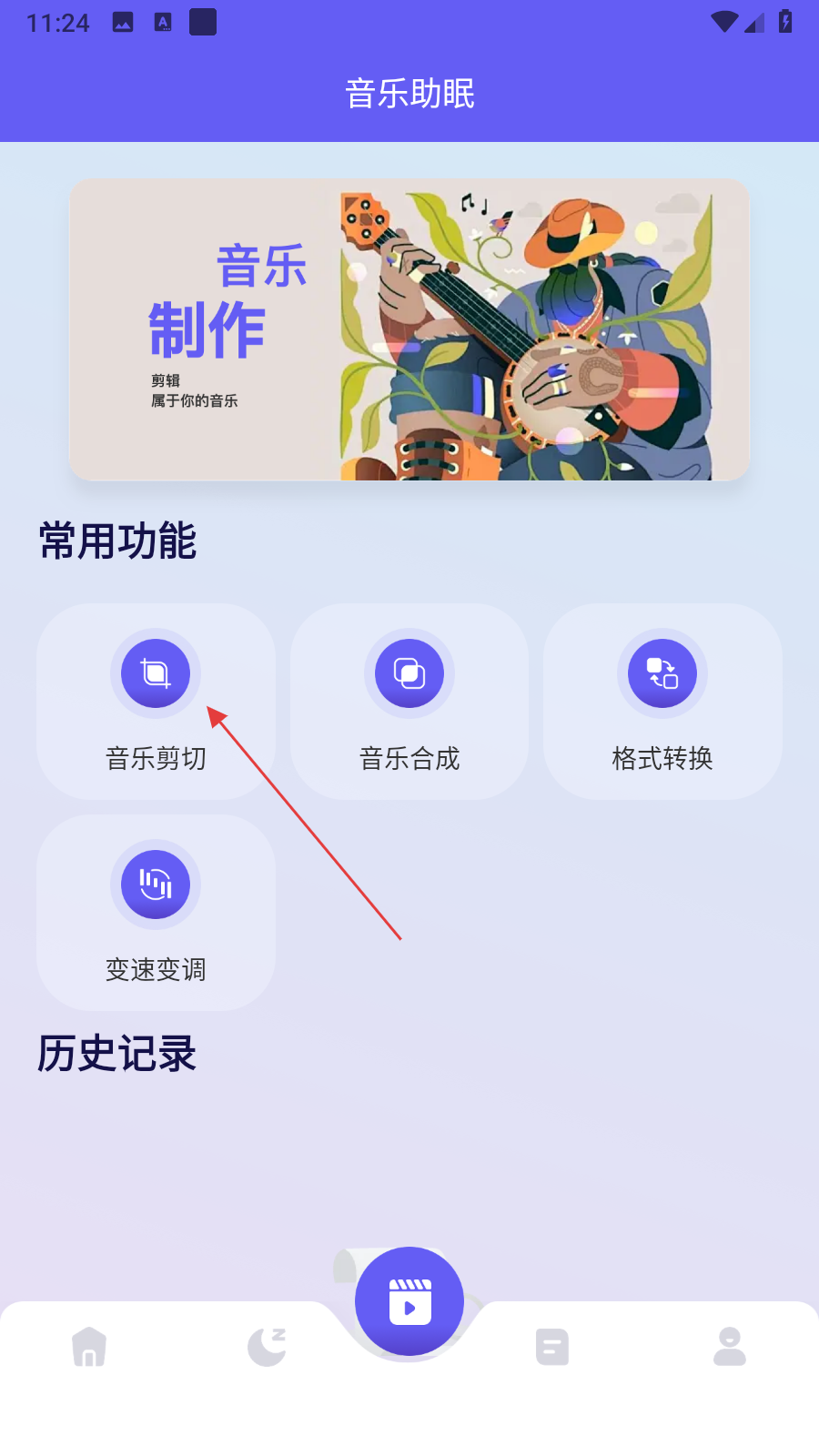 2、在音乐助眠功能页,点击【音乐剪切】,进入选择音乐页面。