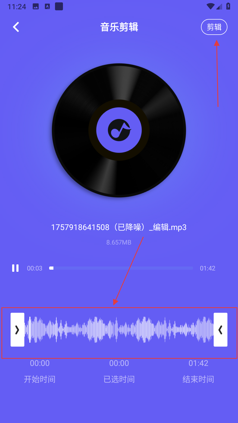 4、在音乐剪辑页,调整好【剪辑的开始与结束时间】后,点击【剪辑】,即可完成音乐剪切操作。