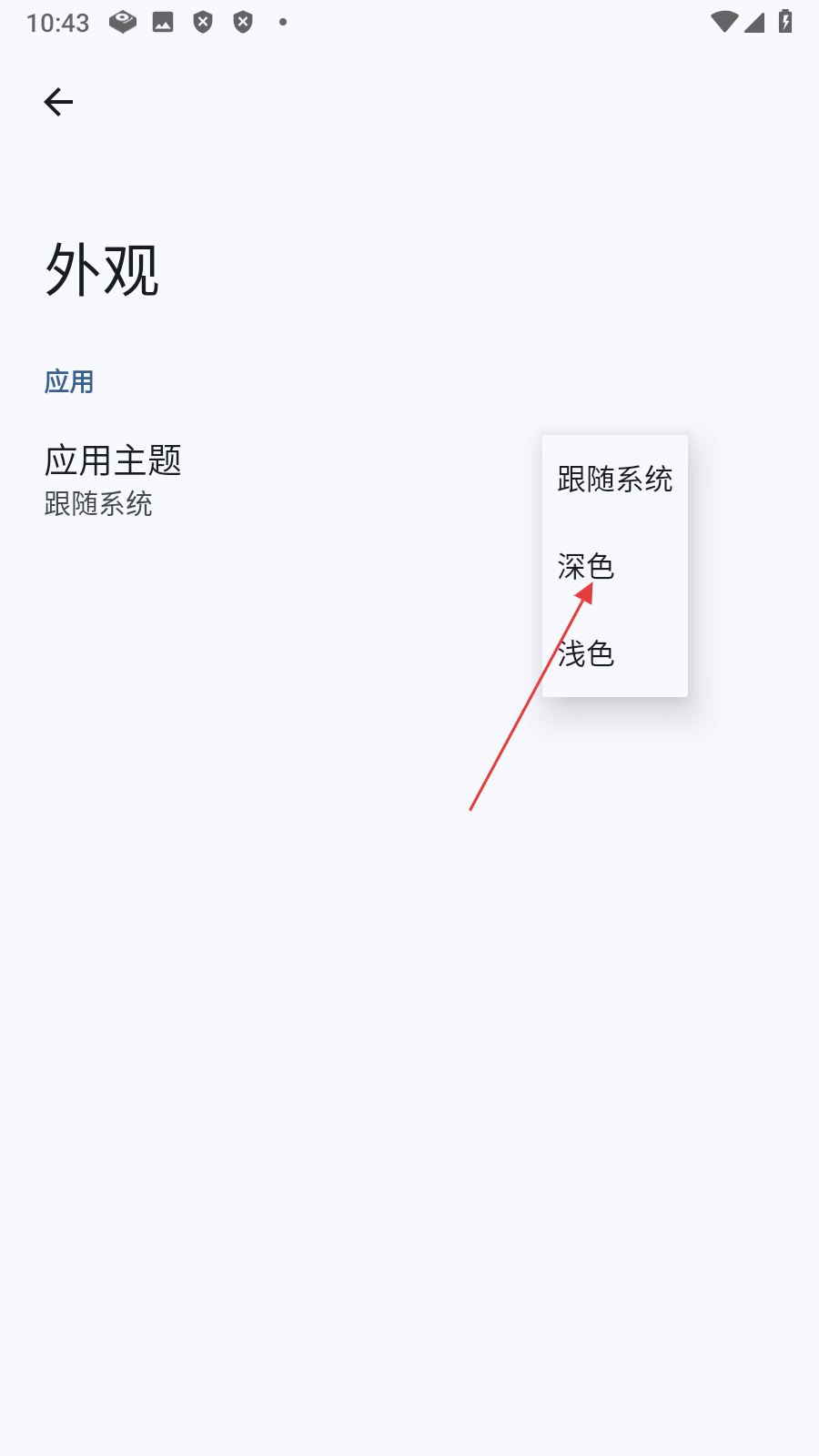 4、在主题选择选项中,选择【深色】,即可将应用主题切换为深色模式。