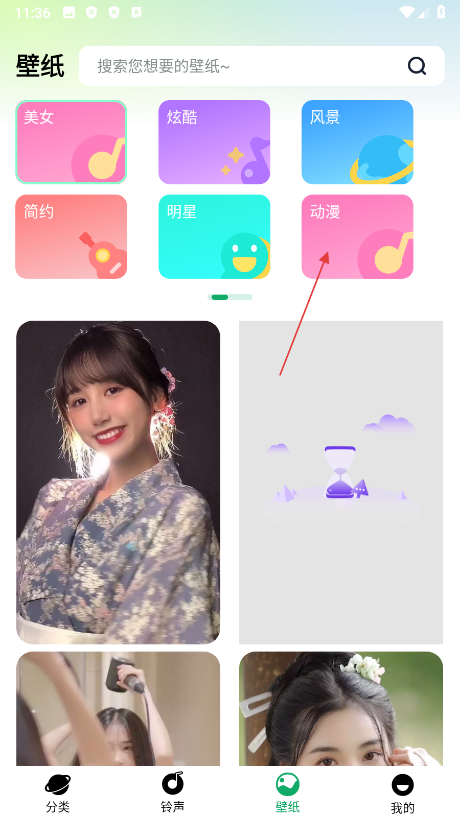 2、在壁纸分类界面中,找到并点击【动漫】分类,看到相关的动漫壁纸。