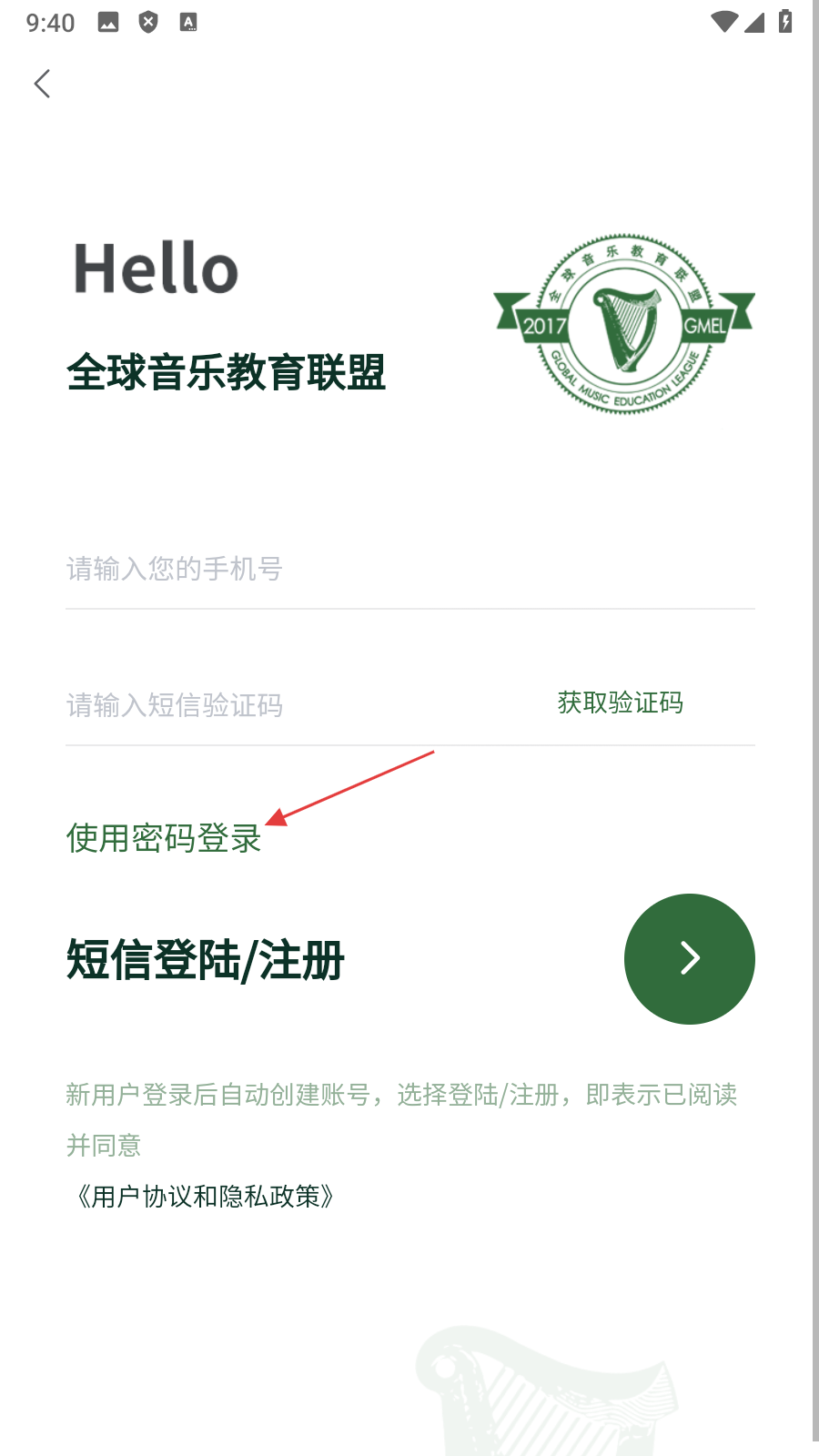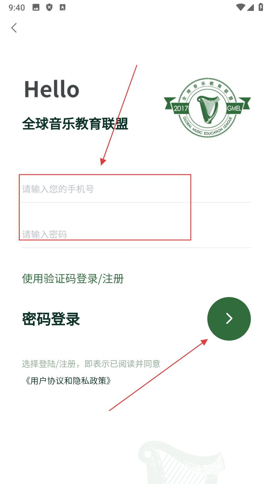 4、在密码登录模式下,输入【手机号和密码】,点击【右侧箭头按钮】完成登录。
