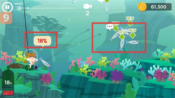 2、捕鱼关卡中瞄准带有【NEW】标识的鱼群,发射鱼叉捕捉,同时关注氧气瓶的【18%】剩余量。