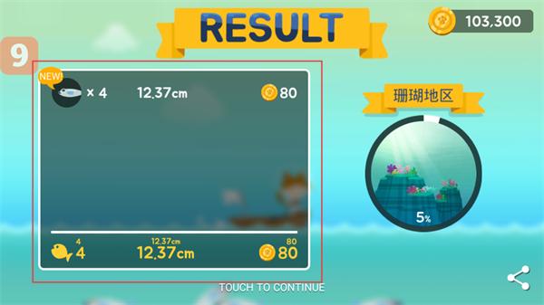 3、捕鱼结束后查看【RESULT】界面,确认捕捉的鱼数量与获得的【金币】奖励,点击触摸继续。