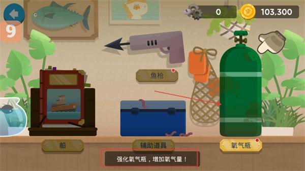 4、在道具界面选择【氧气瓶】,通过强化它增加捕鱼时的氧气量,提升捕鱼的持续时间。