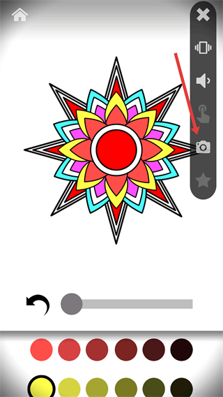 4、在设置界面中,点击红色箭头指向的相机按钮,可对当前涂色完成的图案进行拍照保存。