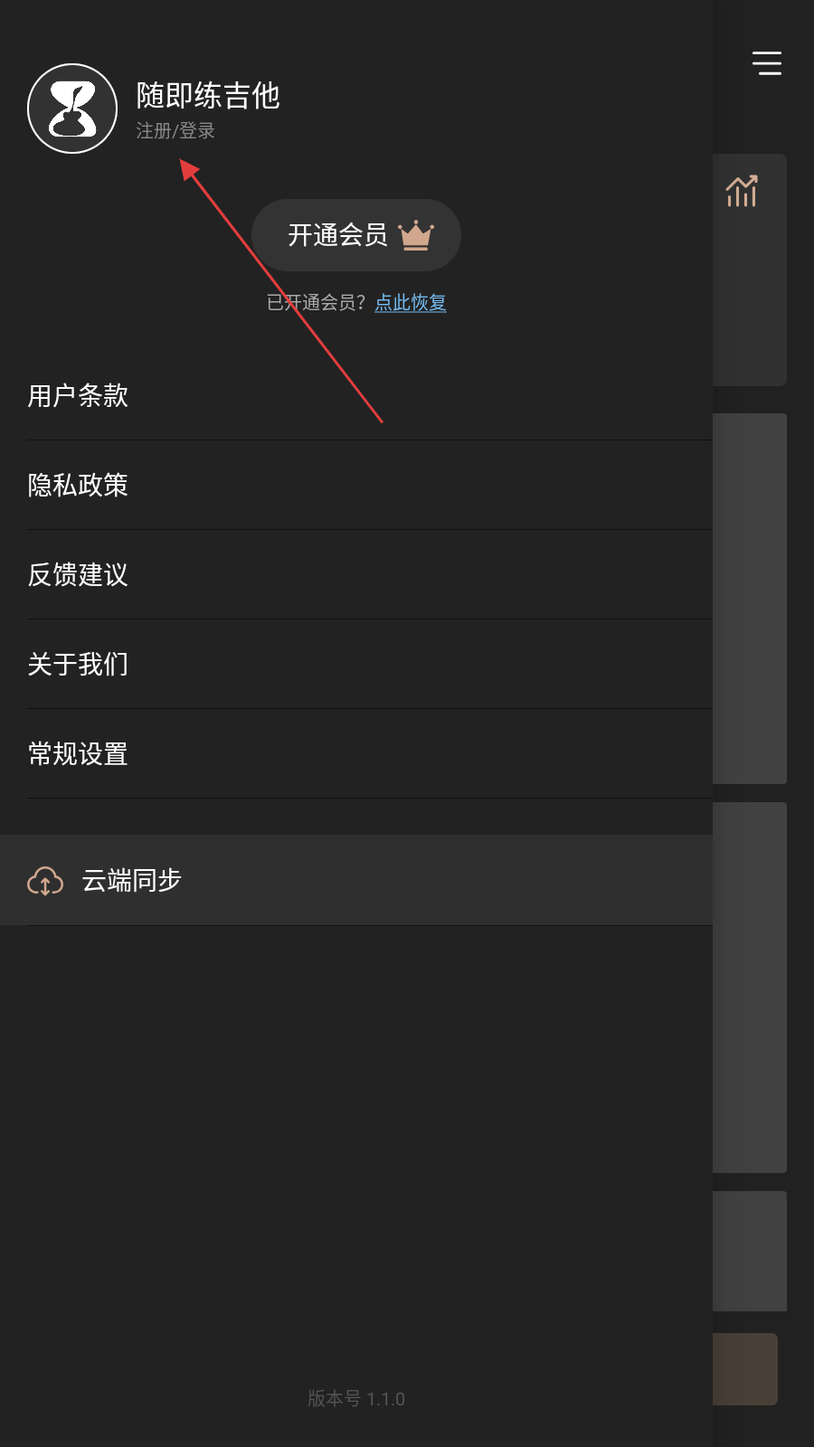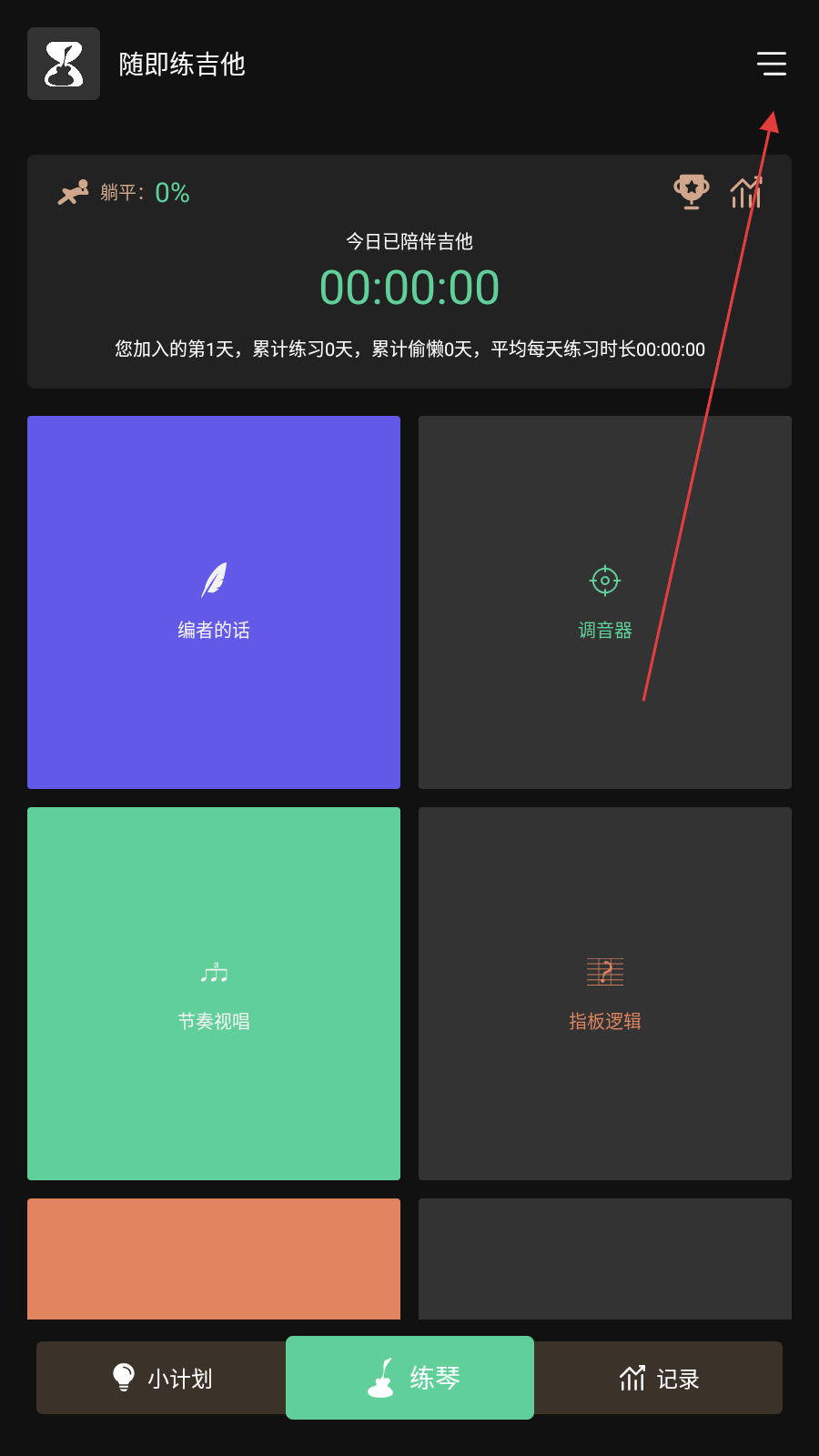 1、在随即练吉他主界面,点击右上角【三条横线图标】,弹出侧边菜单。