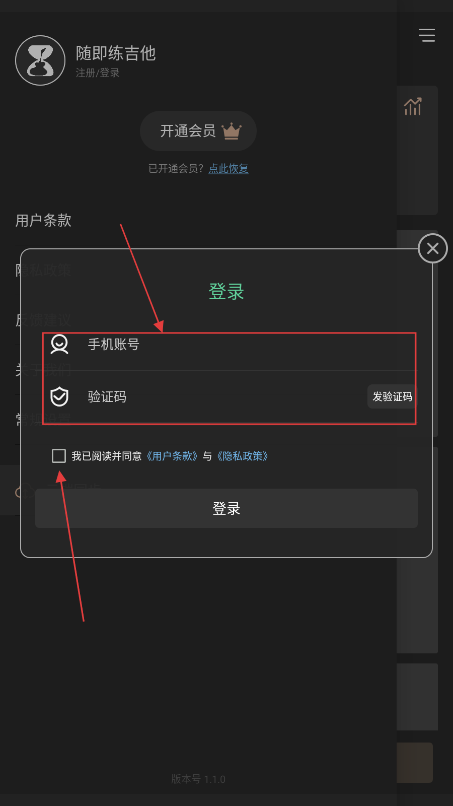 3、在登录窗口,输入【手机账号和验证码】,勾选【同意协议】。