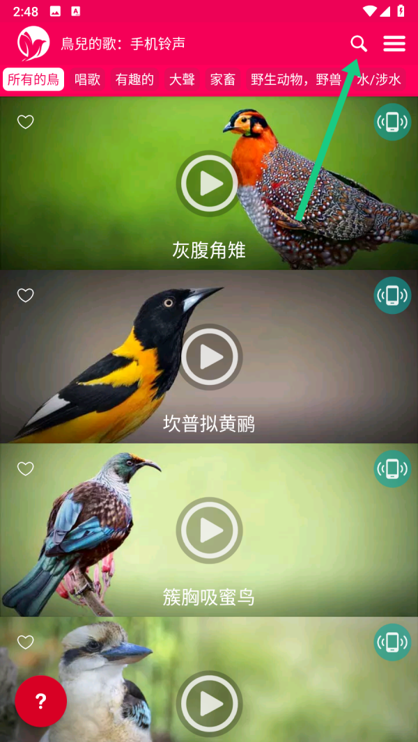 1、在鸟儿的歌手机铃声主界面,点击右上角【搜索图标】,激活搜索框。