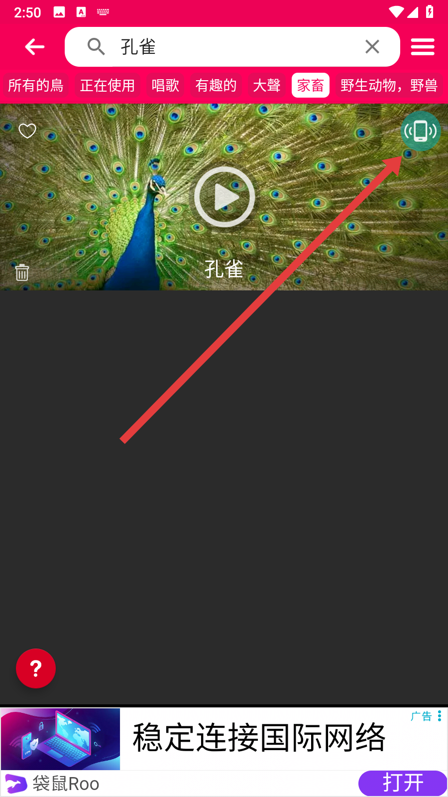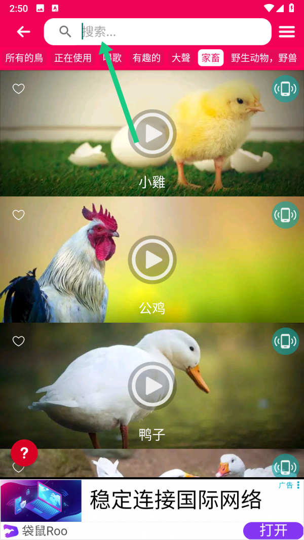 3、搜索结果出来后,点击鸟类右侧的【手机图标】,弹出功能选项。
