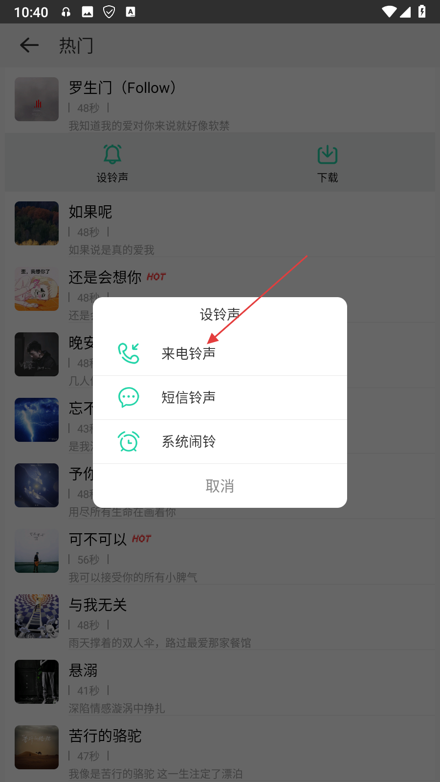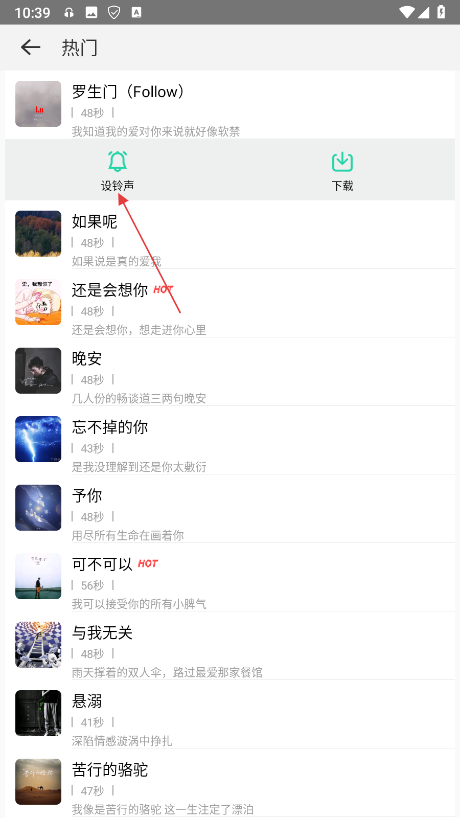 2、在热门铃声列表页面,点击【想要设置的铃声】。