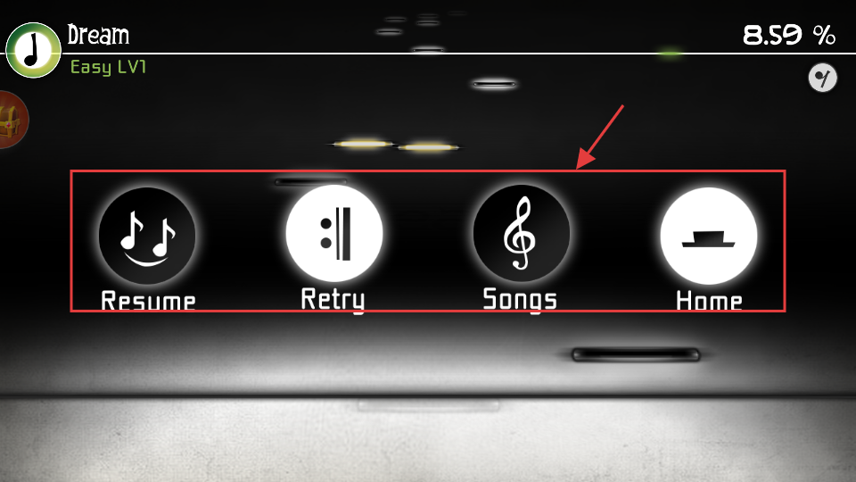 4、根据需求选择【Resume】【Retry】【Songs】【Home】等功能,管理游戏进程。