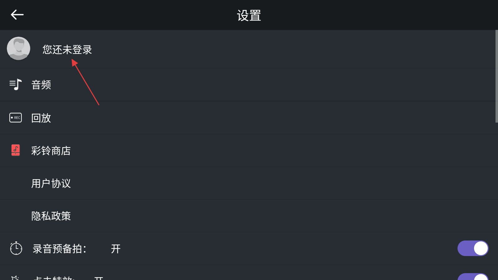 2、在设置页面,点击【您还未登录】区域,进入登录页面。