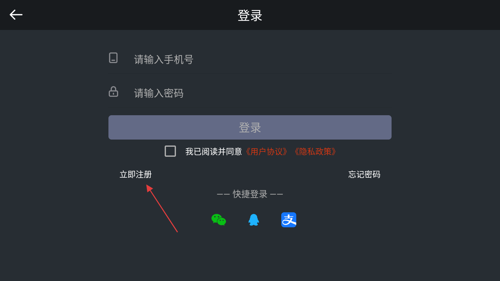 3、在登录页面,点击【立即注册】选项,进入注册页面。