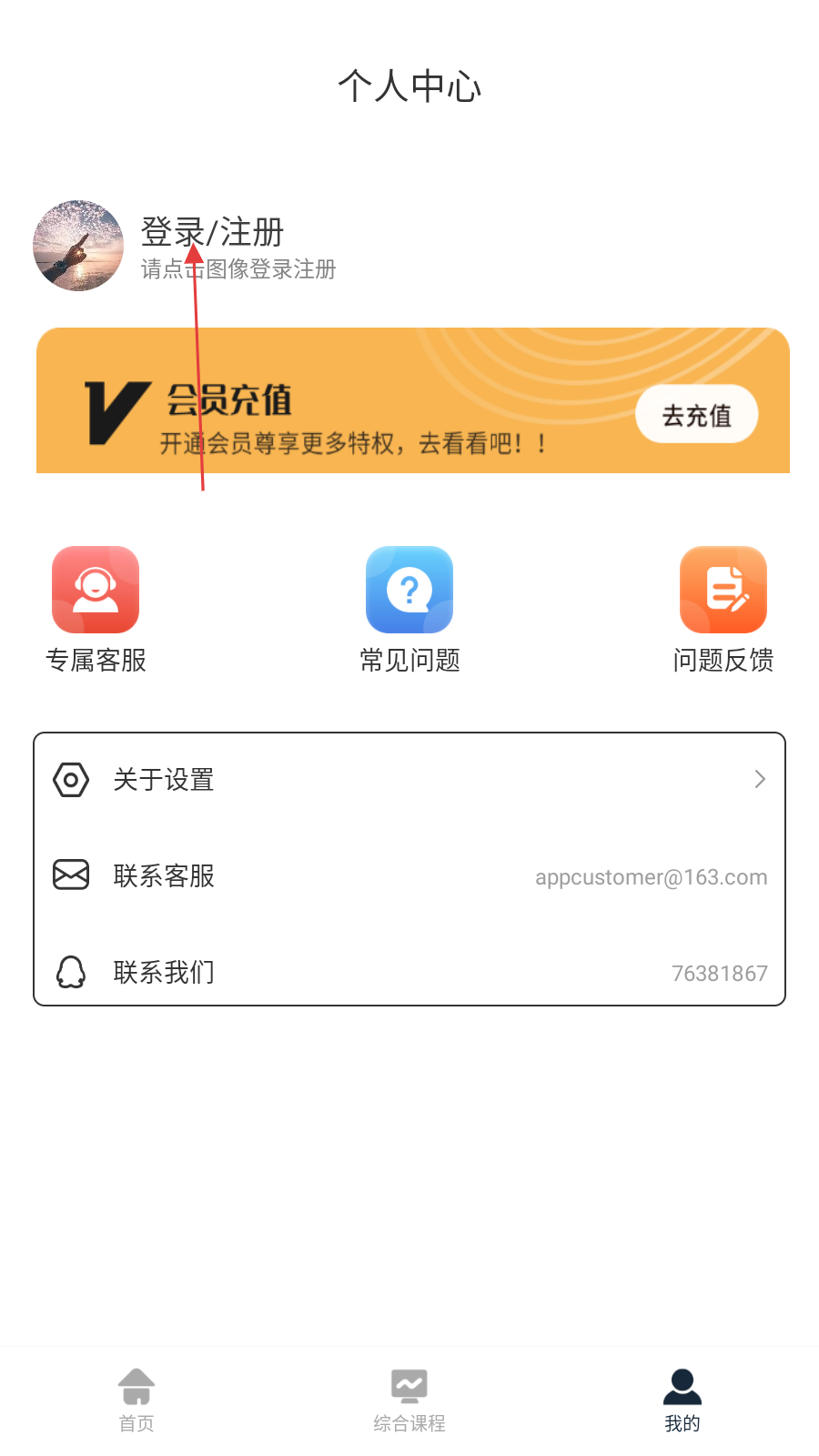 2、在个人中心页面,点击【登录/注册】区域,进入登录页面。
