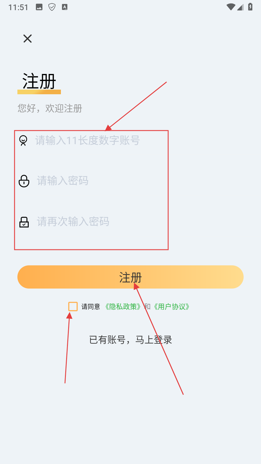 4、依次输入【信息】,勾选【同意协议】后,点击【注册】按钮即可完成注册。