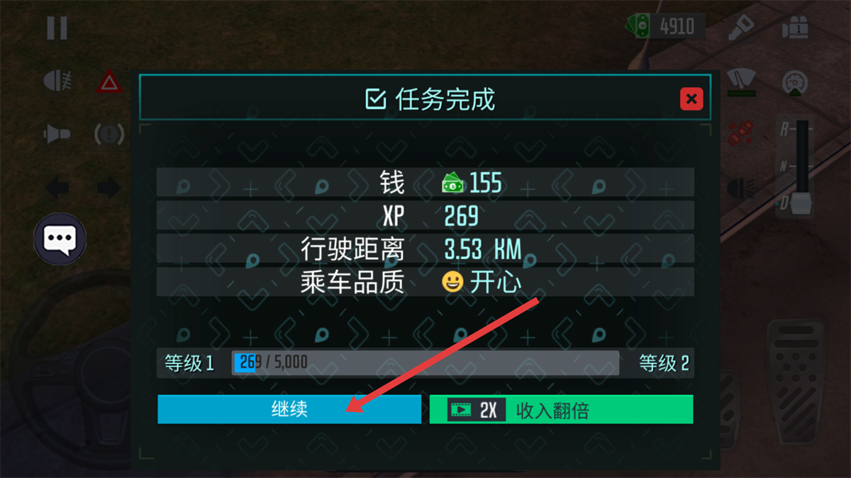 4、任务完成后点击继续按钮,领取钱和经验,赶紧开启下一单,升级赚钱效率更高哦。