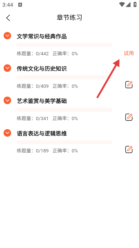 2、进入章节练习页面,选择具体章节进行练习。
