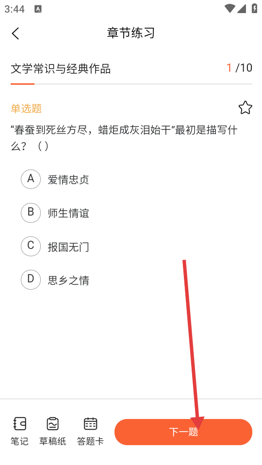 3、进入具体章节练习,可进行作答,作答后点击【下一题】。
