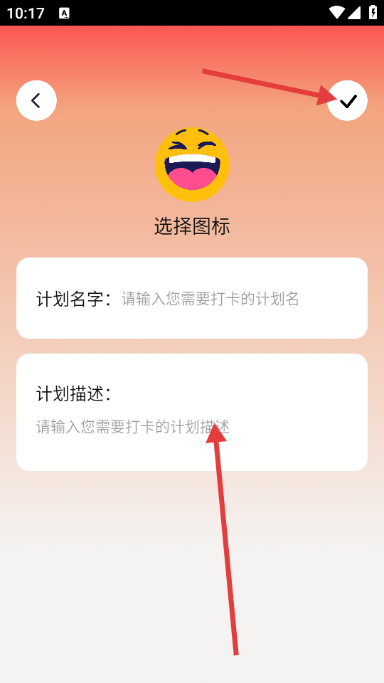 3、在添加计划页面,选择图标,输入计划名字、计划描述等信息后,点击右上角确认图标。