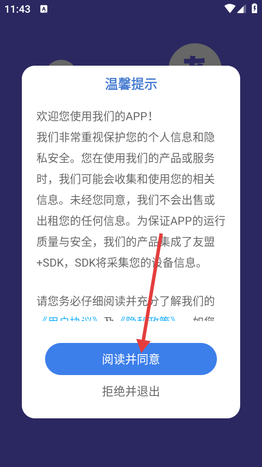1、首次打开APP,在“温馨提示”弹窗中点击【阅读并同意】。