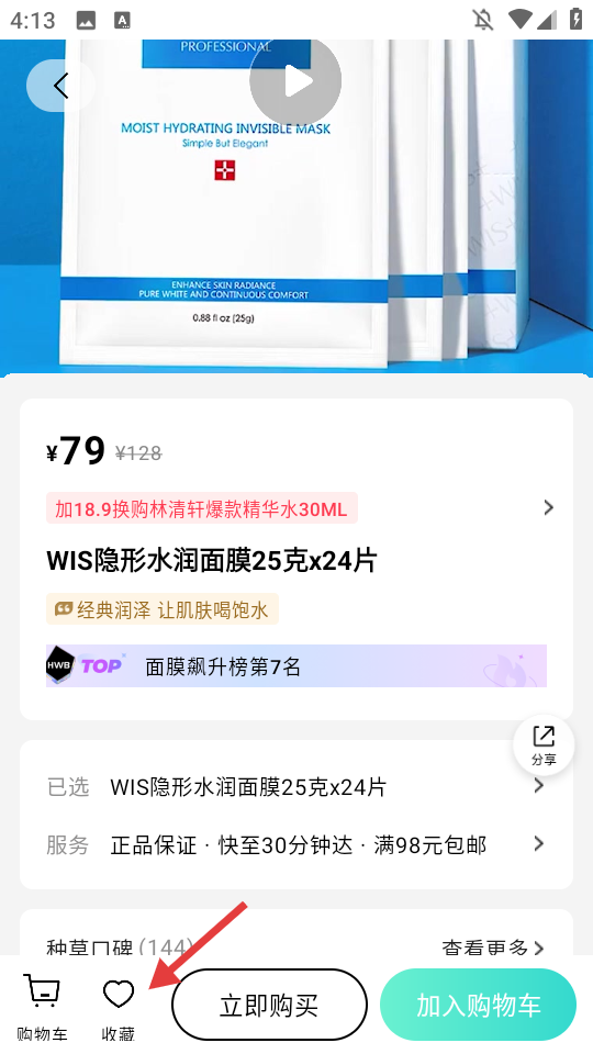 4、进入商品详情页,点击【收藏】,将该面膜商品加入收藏夹。