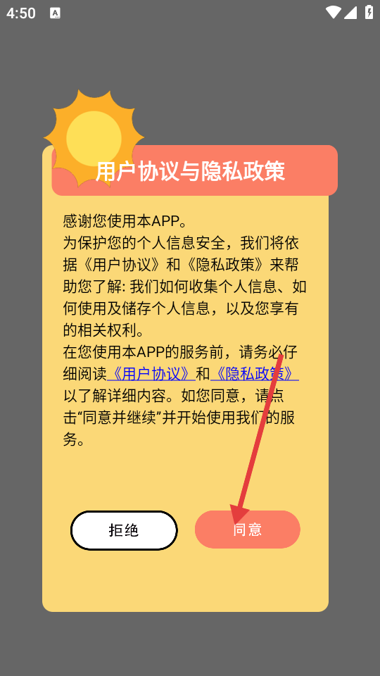 1、打开APP,在“用户协议与隐私政策”弹窗中点击【同意】。
