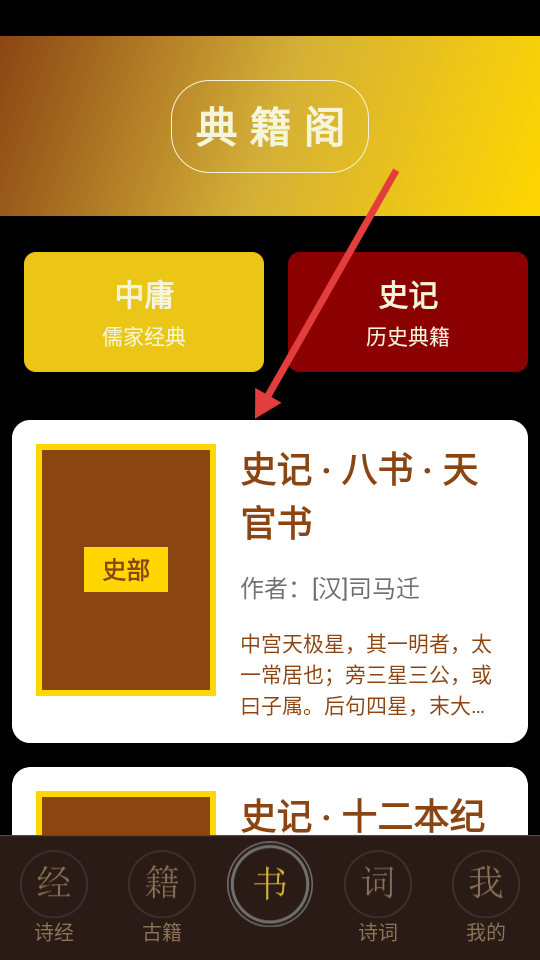 3、进入“书”板块的“典籍阁”页面,找到并点击要查看的典籍。