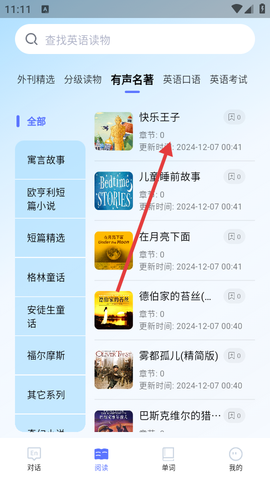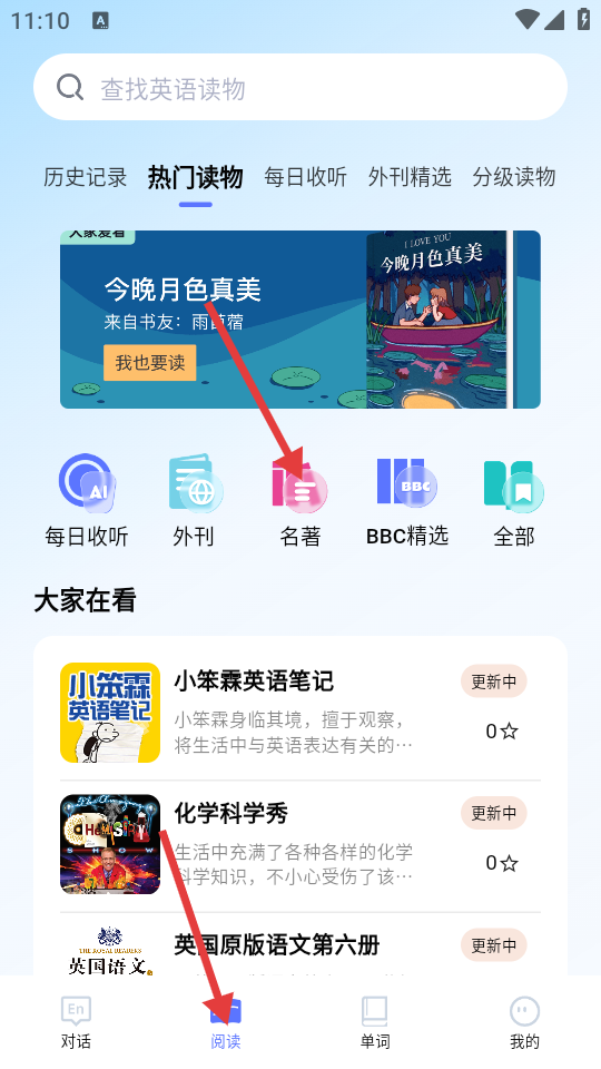 1、进入【阅读】页面,可点击【名著】进入有声名著页面。