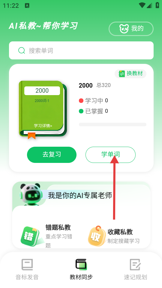 2、进入教材同步页面,可点击【学单词】开始单词学习。