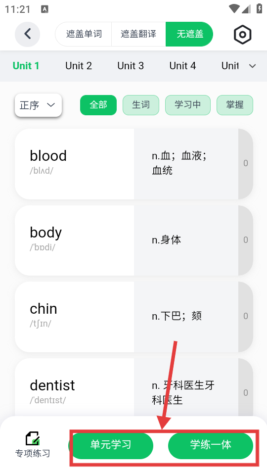 3、在单词学习页面,可选择【单元学习】或【学练一体】模式,进行单词学习。