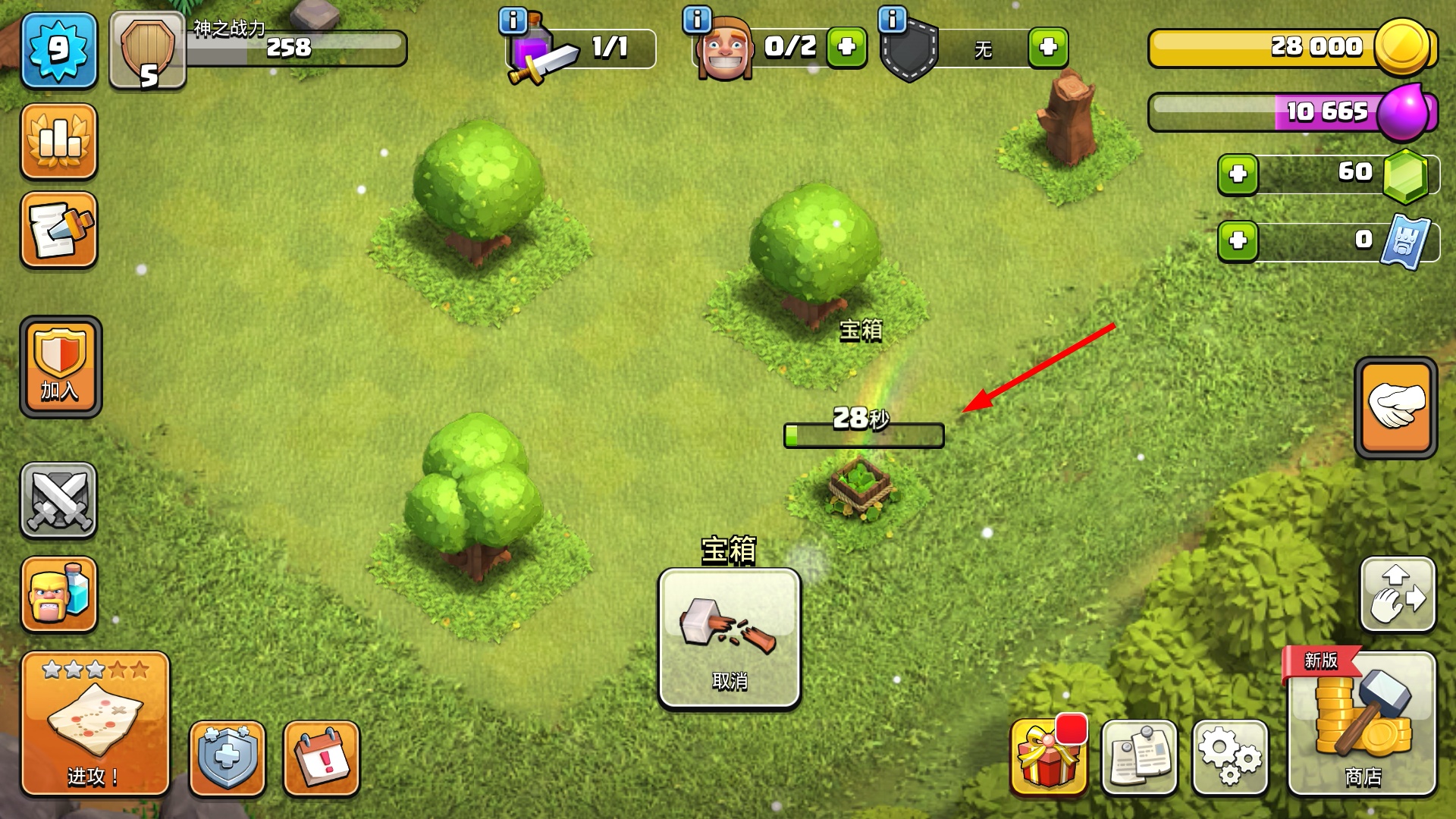 4、点击移除宝箱后,等待【28秒】倒计时完成清除,腾出的位置可用于布置新建筑或调整防御设施。