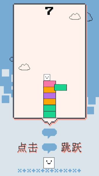 弹跳小方块手机版拥有小清新的画面,整个色调十分养眼,可爱的小方块会跳来跳去,大家只需要在合适的时机点击它,一方面要注意不能被方块打中,另一方面还要稳稳的将彩色块踩在脚下,每累积一个彩色积木就能加一分哦!