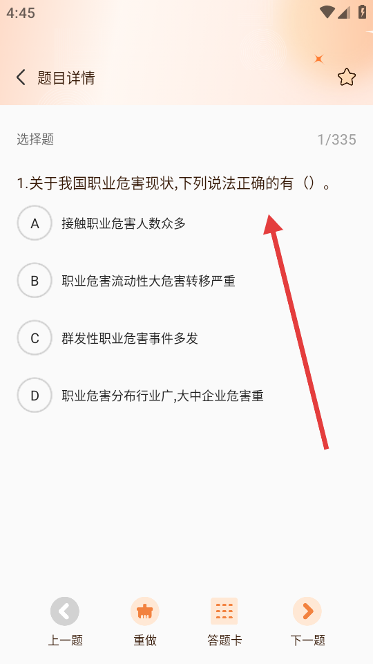 1、练习操作流程:打开即可选择不同题库类型进行刷题练习,答题过程中可随时收藏重点题目便于后续反复学习。
