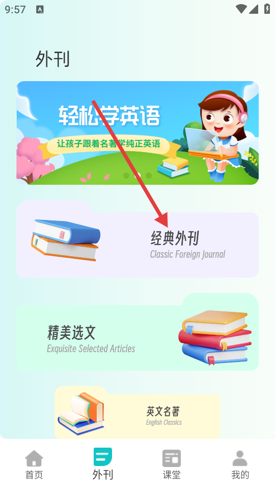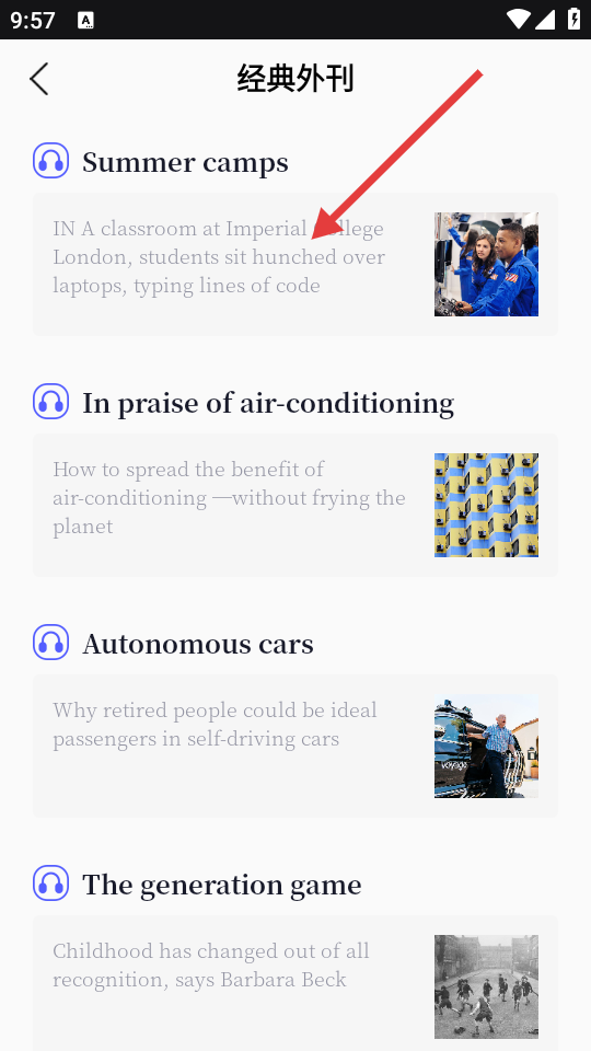 3、进入经典外刊页面,选择感兴趣的文章进入。