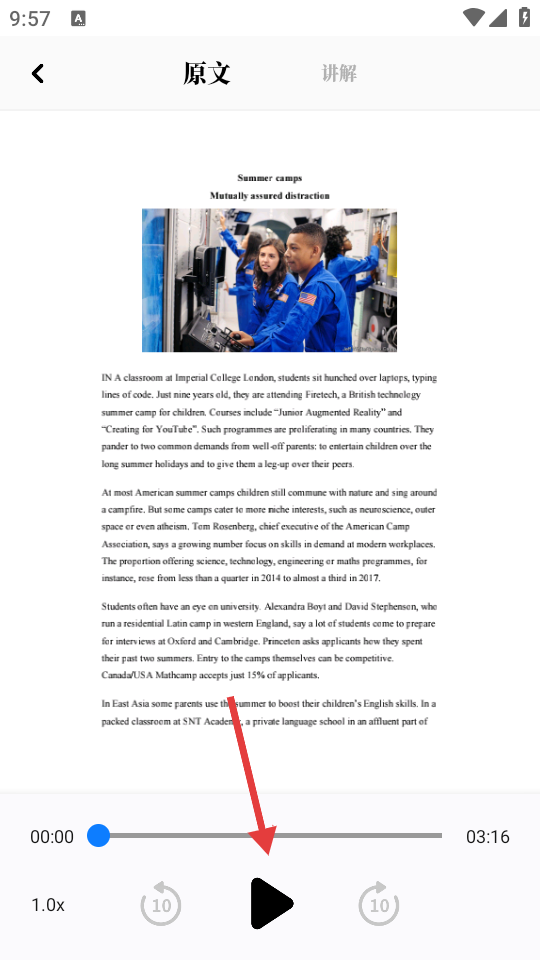 4、进入文章原文页面,可点击播放按钮,配合进度条进行听力等学习操作。