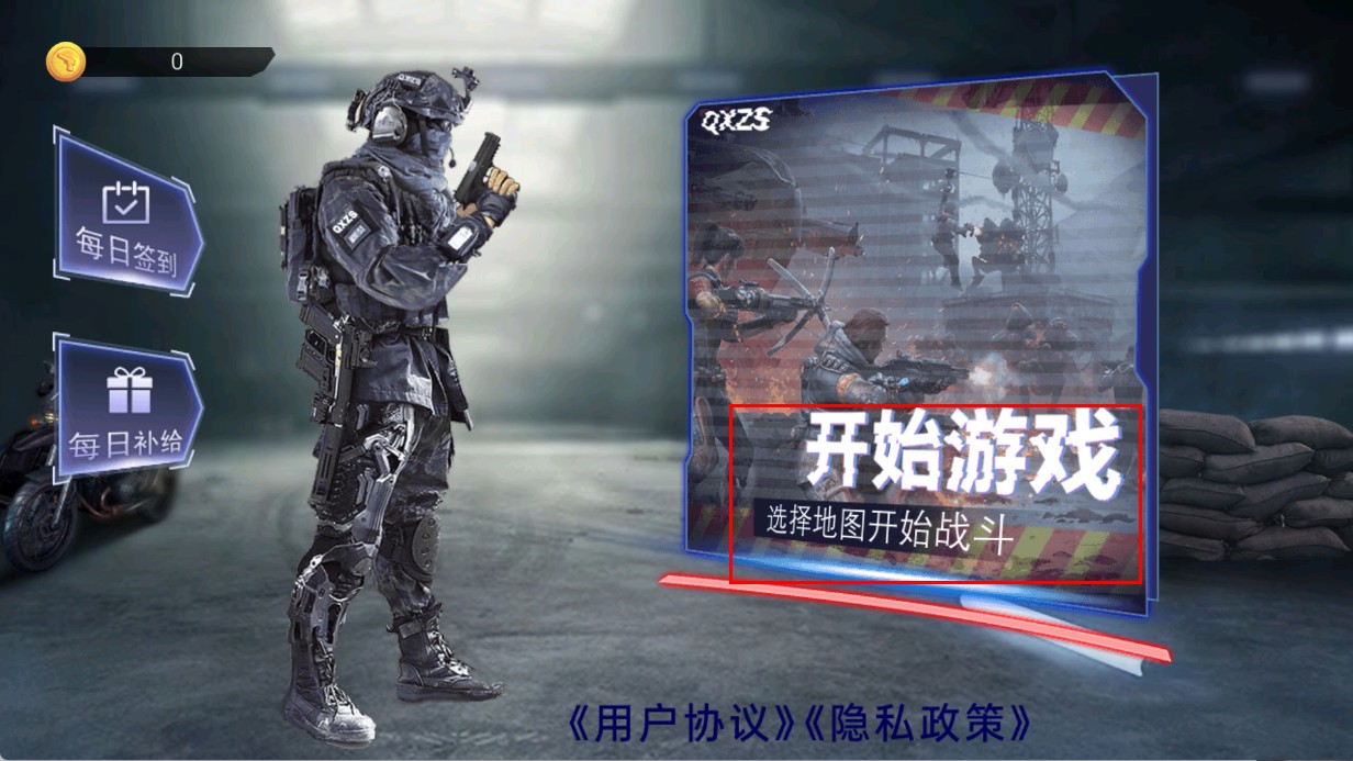 1、启动游戏后先点击每日签到领奖励,再通过每日补给获取武器,最后点击开始游戏进入射击训练。