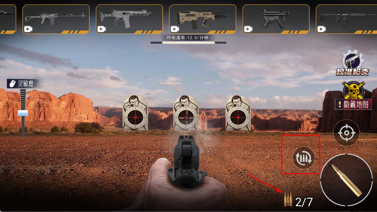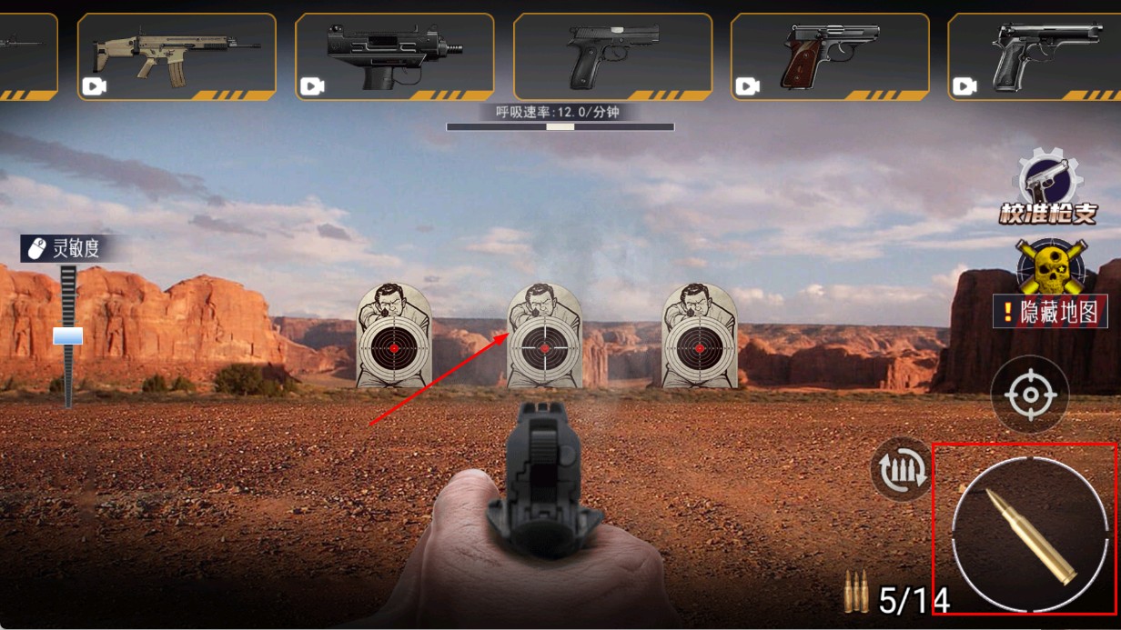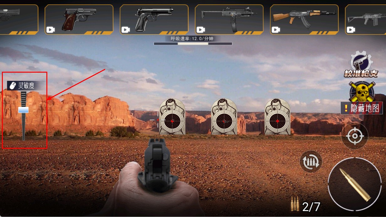 4、通过左侧灵敏度调节条调整操作手感,瞄准多个靶心射击训练,熟悉不同枪械的性能特点。