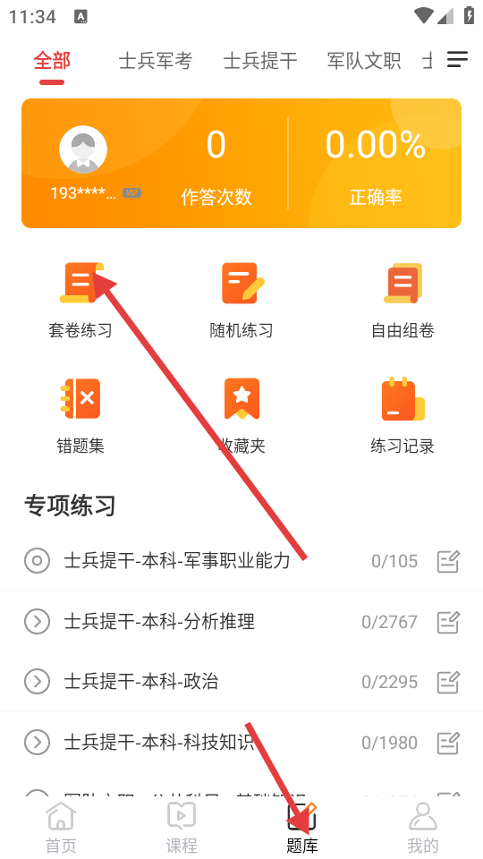1、打开APP,在题库页面中,点击【套卷练习】功能选项。