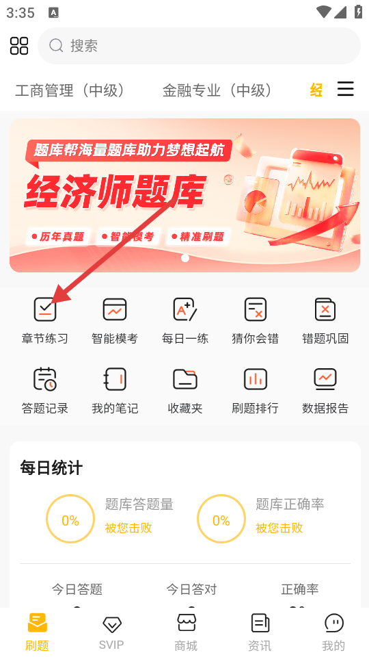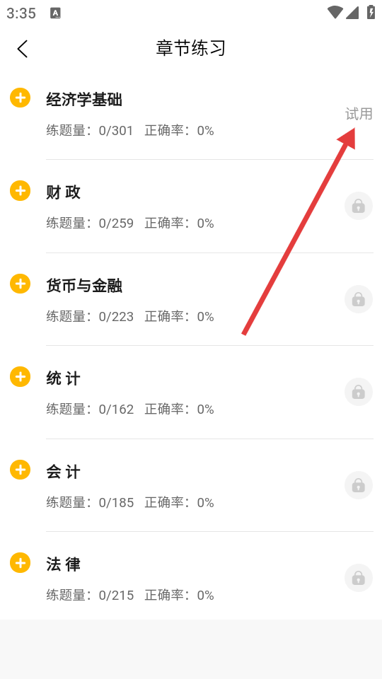 2、在章节练习页面,选择目标章节,如“经济学基础”。