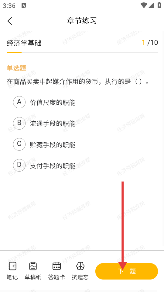 3、进入该章节练习答题界面,进行题目作答,可点击【下一题】继续答题。