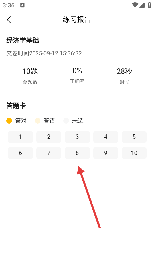 4、完成练习后,进入练习报告页面,可查看总题数、正确率、时长等答题情况。