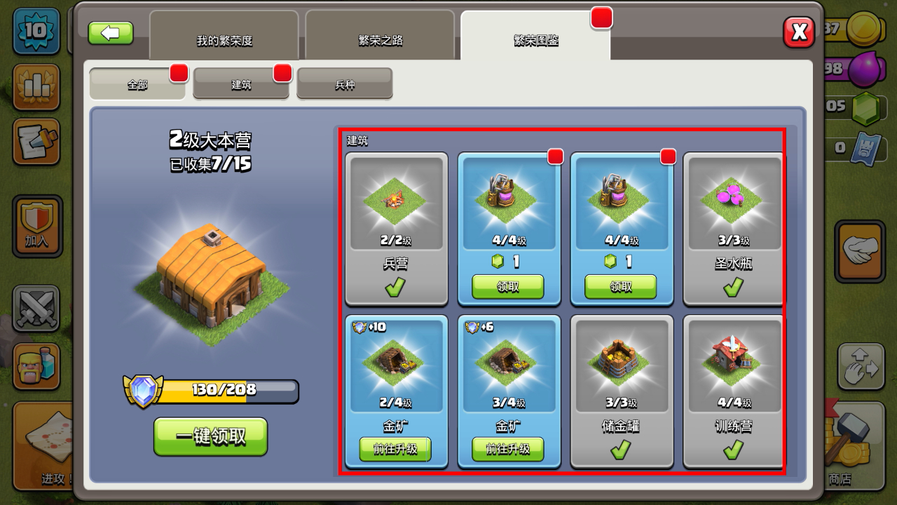 2、处理【2级大本营】的建筑奖励,领取可领取的建筑奖励,对未满级的【金矿】点击前往升级,提升资源获取。