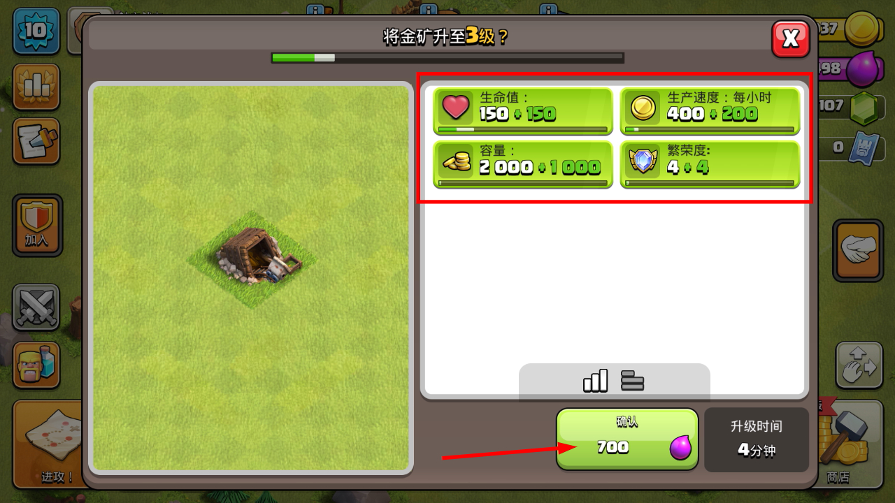 3、升级【金矿】至3级可提升生命值、生产速度等属性,增加资源产量与繁荣度,确认消耗资源完成升级。