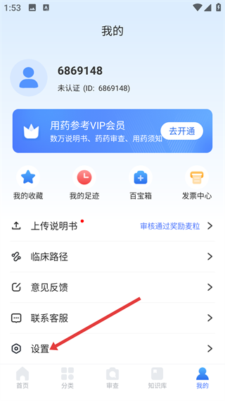 1、打开【用药参考】软件,进入“我的”页面,点击【设置】选项哦。